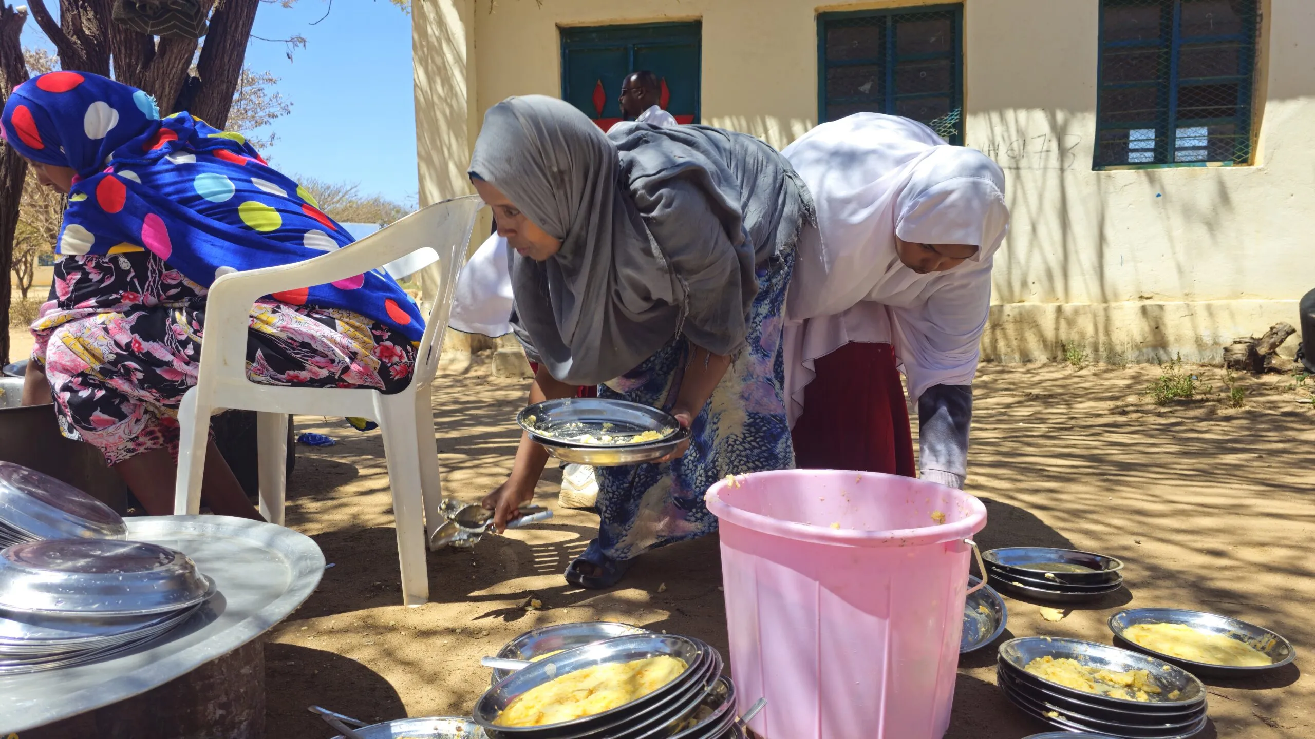 “It gives me joy to see their happy faces,” Muna says, smiling herself as she portions meals out in bowls for the students.