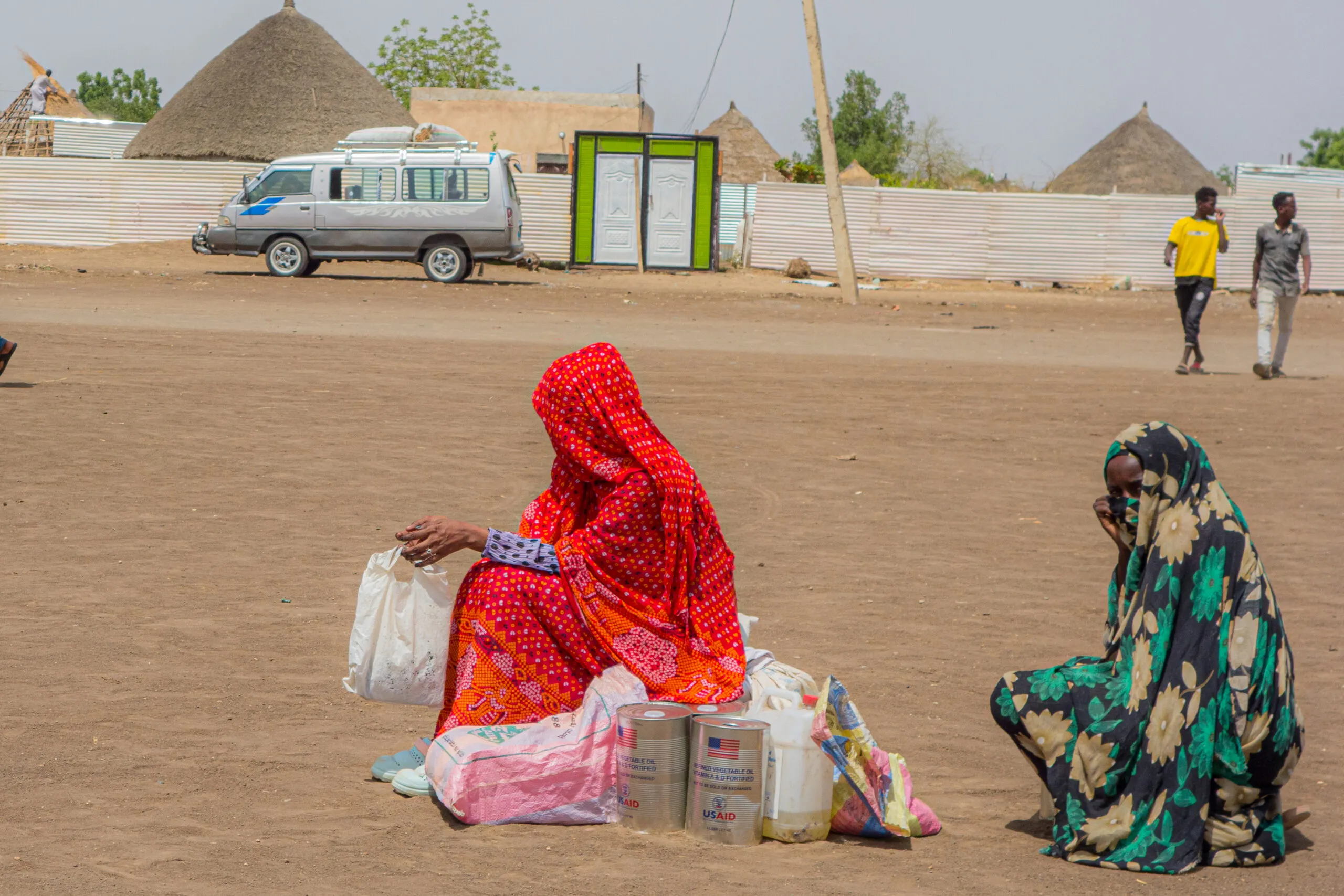 Two internally displaced Sudanese women sit on food aid sacks received from CARE, waiting for transport. One woman's face is partially visible, while the other's is fully covered. A van and two men walking are visible in the background