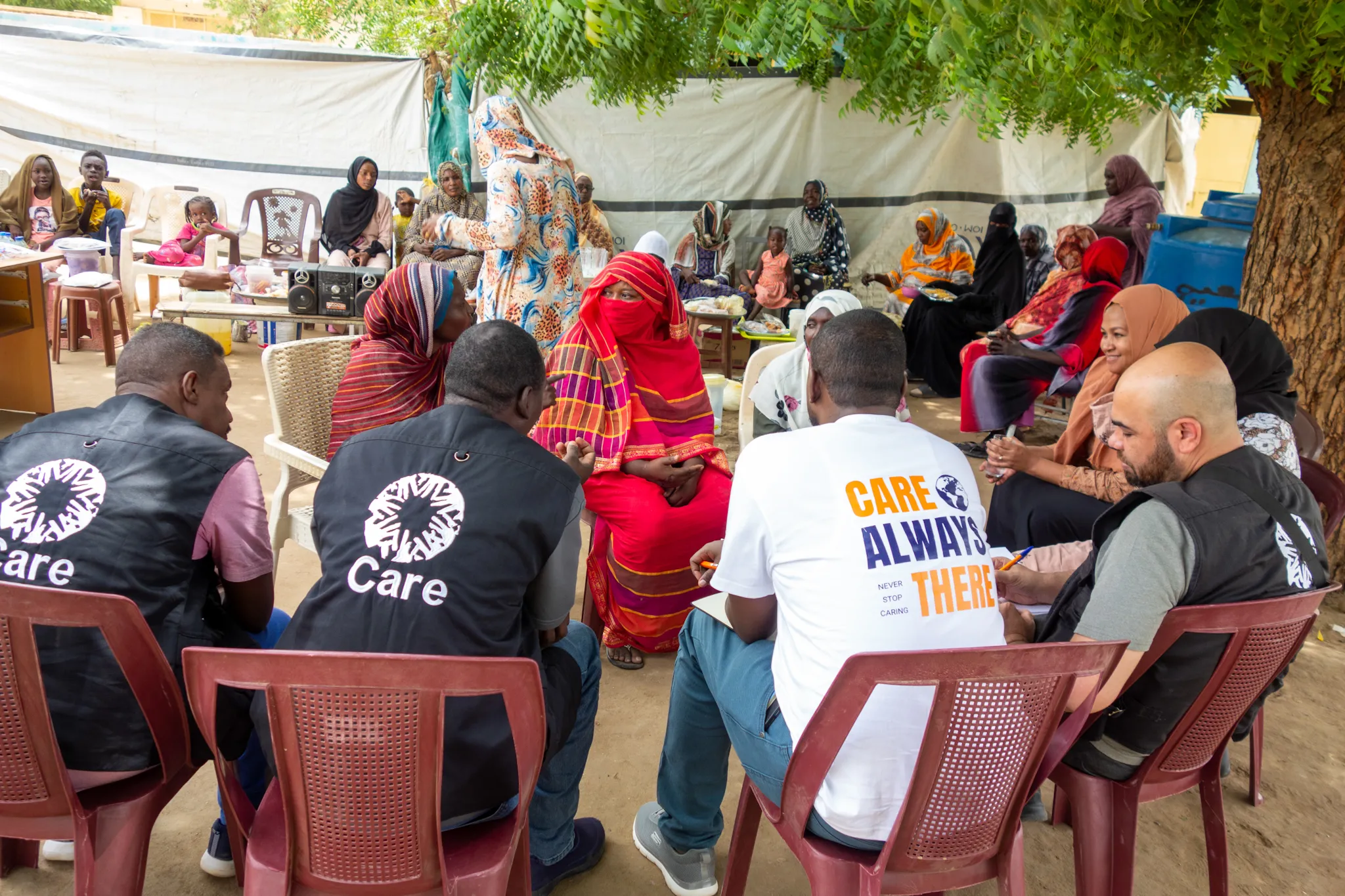 Abdirahman Ali, CARE Sudan Country Director, and Hussein Arban, CARE Sudan Deputy Contry Director of Programs talk with women who had fled to Kassala on 14th July 2024. Photo: Mohamed Abdulmajid/CARE