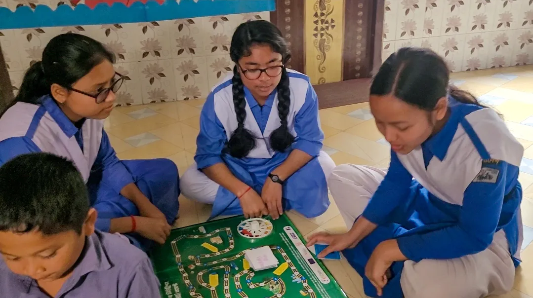 In their free time at school, Unmi and her friends play customized board games to learn about health and nutrition issues. Photo: Sarah Easter/CARE