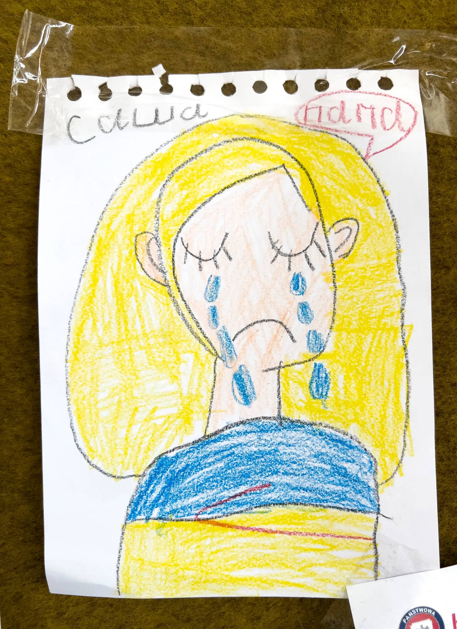 Some of the many drawings by Ukrainian refugee children that were informally displayed at an arts and crafts station in a converted school gym, Hala Sportowa, Lubycza Królewska.