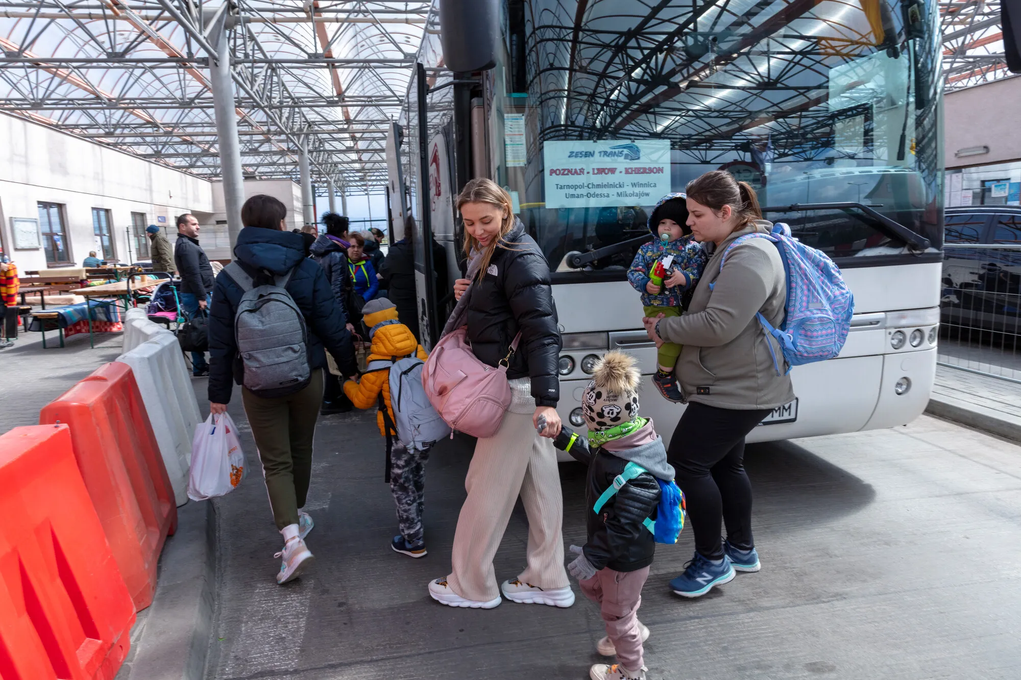 Ukrainian refugees, including Valeria and her son Misha, cross the border into Poland near the town of Hrebenne. In the border zone between Ukraine and Poland, refugees that cross on buses must pass through a checkpoint with their luggage.